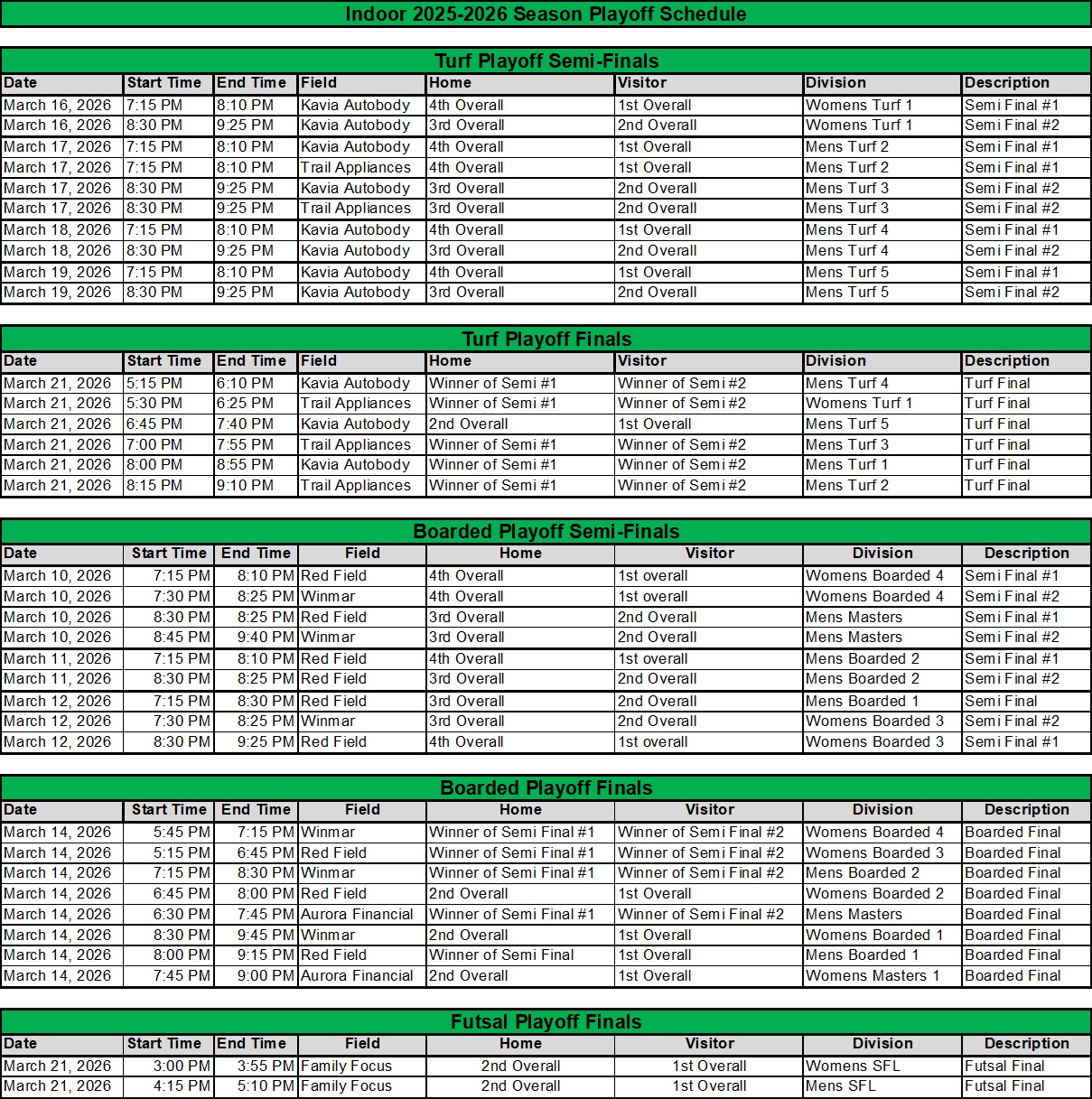 Indoor Playoff Schedules